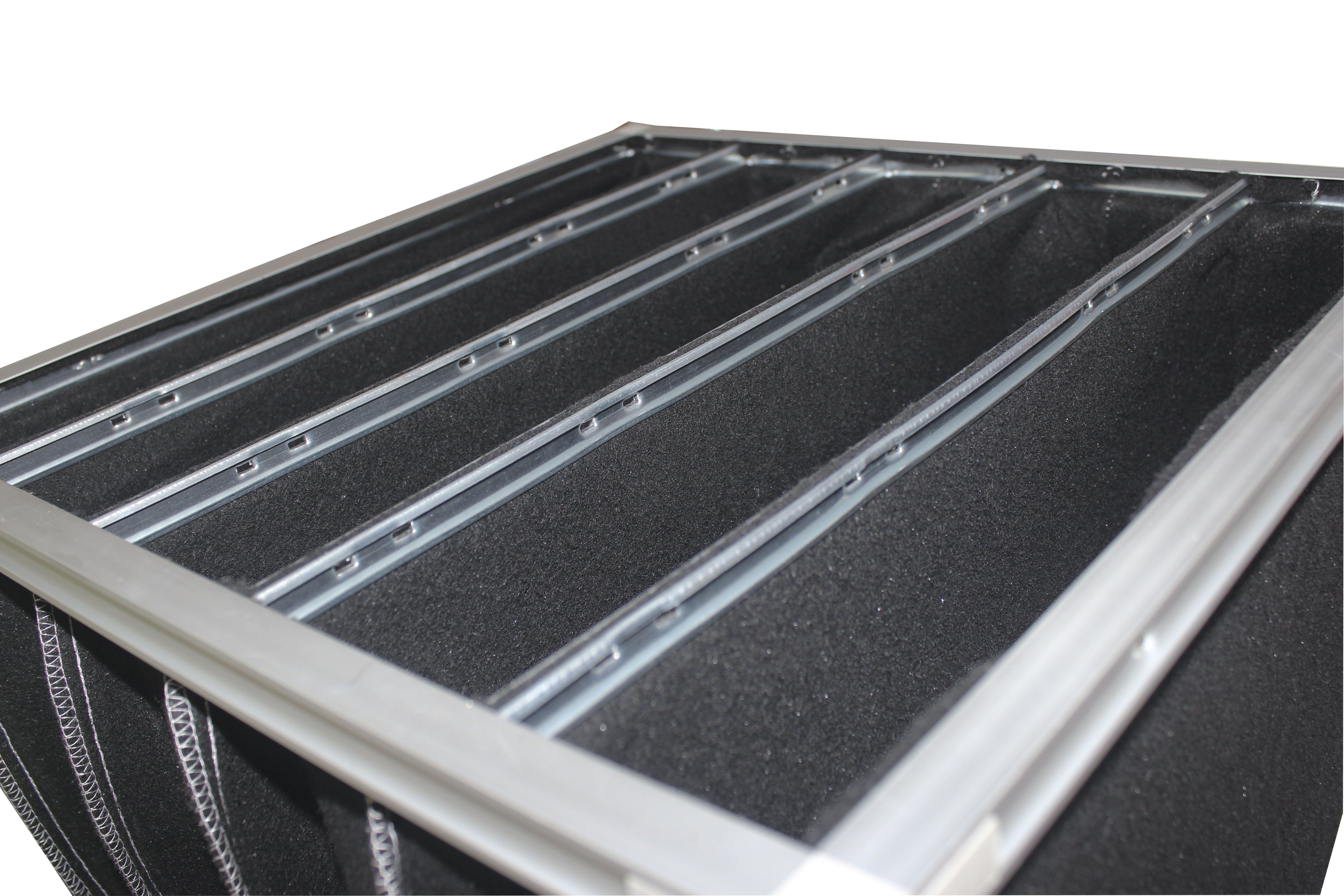 优质活性炭过滤棉,透气性好,含碳量高,吸附效果好,过滤面大,滤袋与支撑边框采用刚性连接结构,保证滤袋密封。